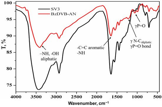The following bands can be seen in the SV3 pristine copolymer’s FTIR spectra (Figure 1): N-H groups were allocated to the primary amine at 1448 cm−1 and 708 cm−1; 3434 cm−1 and 1647 cm−1 were ascribed to the -NH2 and -CH2 bonds at 2931 cm−1. The FTIR spectrum of the Bz-DVB-AN sample showed adsorption bands in the following areas: 3510–3350 cm−1 attributable to (aliphatic–NH, and -OH), 1680–1570 cm−1 attributable to (-C=C, aromatic ring, NH in secondary and primary amines, respectively), 1360–1210 cm−1 attributed to (γN-Caliphatic, γP=O bond), 1169–950 cm−1 attributed to (γP=O) and 880–709 cm−1 assigned to (N-H groups in the amine primary and P-OR) [18,19].