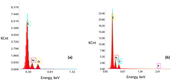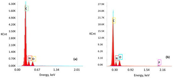 FTIR spectroscopy (KBr pellets) was performed on a JASCO FTIR spectrophotometer (JASCO, Tokyo, Japan) in the range 4000–400 cm−1. Products were characterized by thermogravimetric analysis on a TGA/SDTA 851-LF1100-Mettler (Switzerland) device at a temperature ranging from 25 to 800 °C and at a heating rate of 10 °C/min, under nitrogen atmosphere. The elemental composition of the copolymers was evaluated with an Energy-Dispersive X-ray (EDX) analyzer (Octane Elect Super SDD detector, Ametek, Berwyn, PA, USA) equipped on a Verios G4 UC (Thermo Scientific, Brno, Czech Republic) SEM device and Elemental Analyzer UNICUBE—Elementar Analysensysteme GmbH, Langenselbold (Berlin, Germany).
