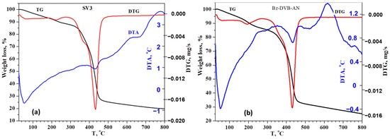Thermogravimetric analysis of the pristine SV3 copolymer (a) and Bz-DVB-AN (b).