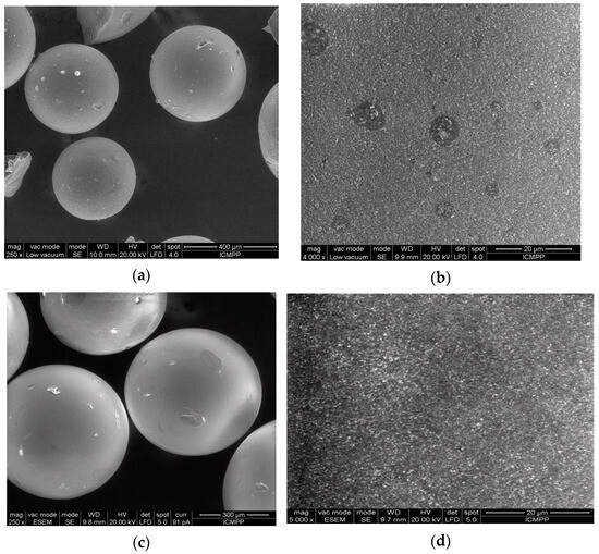SEM images of SV4 (a,b) and Et-DVB-AN (c,d) copolymers; mag: 250× (a), 4000× (b), 250× (c) and 5000× (d).