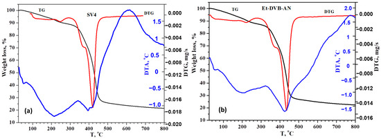 The findings of the TG-DTG-DTA analysis of SV4 in nitrogen are displayed in Figure 8a. The mass loss of physically adsorbed water evaporating in the first stage (25–120 °C) was 5.6% (~60 °C); in the second stage (120–340 °C), it was 4.9% (~220.2 °C) due to pendant group degradation; and in the third stage (340–660 °C), it was 68.0% (~434.5 °C) due to DVB-AN degradation. A total of 21.5% of the residue remained after 78.5% of the total mass was eliminated at 800 °C. Figure 8b displays the TG-DTG-DTA study for the Et-DVB-AN sample. The synthesis product Et-DVB-AN was studied in nitrogen, and three steps of mass losses were noted: the evaporation of the physically adsorbed water was responsible for the first stage (25–140 °C), with—6.69% (~55.9 °C); the pendant group degradation was responsible for the second stage (140–360 °C), with—5.61% (~220.2 °C); and the DVB-AN degradation was responsible for the third stage (360–660 °C), with—65.37% (~422 °C). At 800 °C, 22.33% of the residue was still present after a total mass loss of 77.67%. Thus, the copolymer functionalized with the aminophosphonate group Et-DVB-AN shows a good thermal stability.