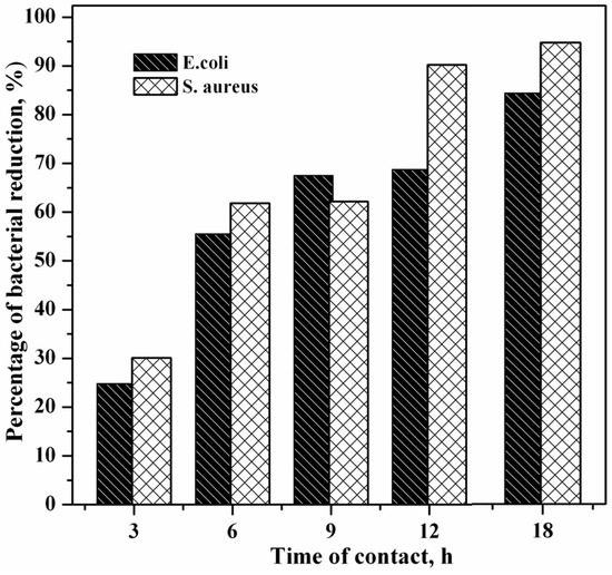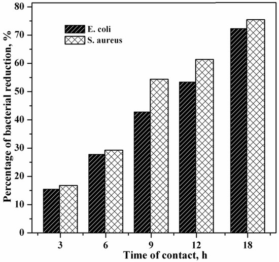 Percentage of bacterial reduction induced by the Et-DVB-AN sample at different intervals of time.