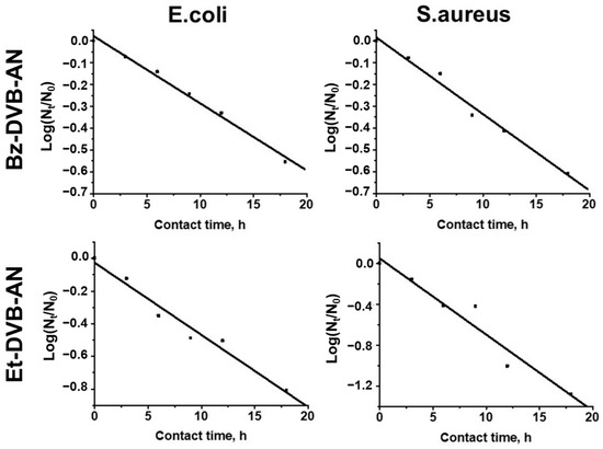 The linear representations of the first-order kinetic model of E. coli and S. aureus reduction by treatment with Bz-DVB-AN and Et-DVB-AN are presented in Figure 11. The decimal reduction time obtained in each case is presented in Table 4.