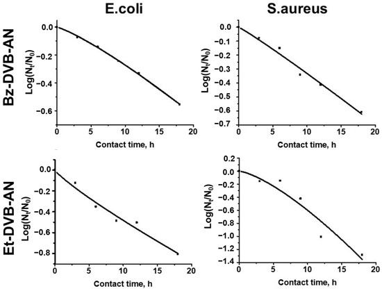 The Weibull model suggests a good fit of the experimental data obtained in all cases, with chi-square values less than 0.003. It could be observed that the obtained graphics present a downward concave curve (n > 1) for E. coli and S. aureus pathogens treated with Bz-DVB-AN and for S. aureus on Et-DVB-AN. This indicates that the S. aureus bacteria are more vulnerable to the materials under study. In the case of E. coli treated with Et-DVB-AN, the fitted model presents an upward concavity (n < 1), assuming that the less-sensitive microorganisms were deactivated at a relatively fast rate but with survivors possibly being unaffected by the treatment.