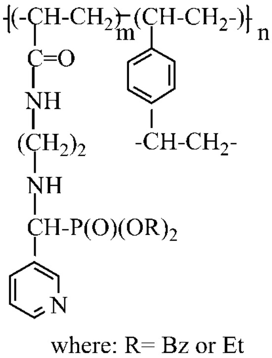 The structures of the final products, Bz-DVB-AN and Et-DVB-AN, are presented in Scheme 1. The proposed structure resulted from the functionalization of the copolymers SV3 and SV4 with 3-pyridinecarboxyaldehyde, and either dibenzylphosphite (Bz-DVB-AN) or diethylphosphite (Et-DVB-AN).
