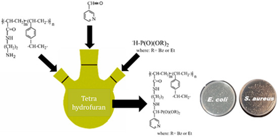 - Nichita, I.; Lupa, L.; Visa, A.; Popa, A. One-pot synthesis, characterization and in vitro antibacterial evaluation of bioactive “aminophosphinic acid” groups grafted onto polymeric-support. Polym. Bull. 2021, 78, 2505–2522. [Google Scholar] [CrossRef]