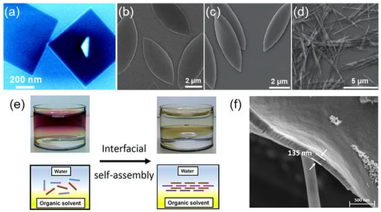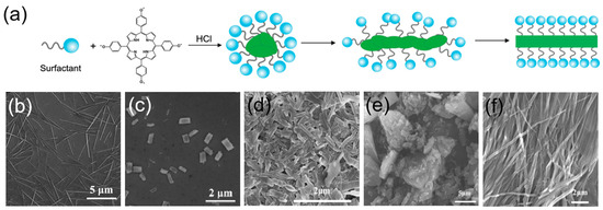 (a) Nucleation and growth of porphyrin nanostructures; (b) SEM image of CTAB-THPP nanowires; (c) SEM image of CTAB-THPP nanorods [74]; (d) SEM image of CTAB-TCPP aggregates; (e) SEM image of TCPP powder; (f) SEM image of TCPP aggregates [75].