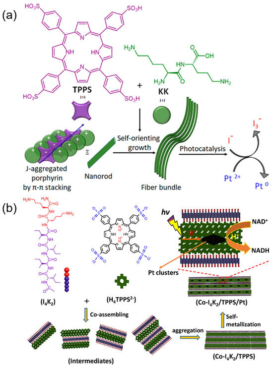 (a) Schematic diagram of the co-assembly of TPPS catalyst and dipeptide (KK) into fiber bundles and photocatalysis [76]; (b) Schematic design and construction of light capture antenna (Co-I4K2/TPPS/Pt complex) [36].