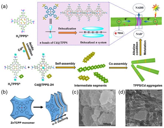 (a) Schematic diagram of the design and construction of a light-harvesting antenna based on the absence of precious metal porphyrins [82]; (b) ZnTCPP self-assembly diagram via π-π interactions; (c) SA-ZnTCPP SEM diagram; (d) SA-ZnTCPP TEM diagram [83].