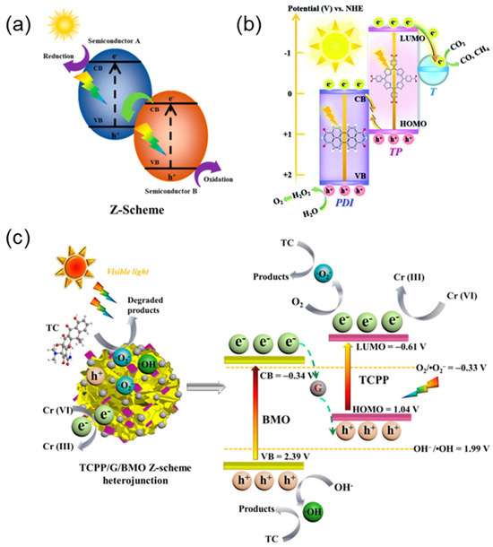 (a) Z-type heterojunction electrons-Schematic diagram of hole pair separation [97]; (b) Photocatalytic charge transfer mechanism of T-TP/PDI heterojunction [98]; (c) Photocatalytic mechanism of TC degradation on TCP/G/BMO under visible light irradiation [99].