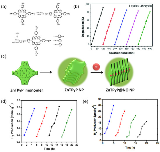 (a) Synthetic routes of TCyPPP, TbePPP, and TPyPPP; (b) Stability test of self-assembled photocatalytic activity of TCyPPP [129]; (c) Schematic diagram of the synthesis of self-assembled ZnTPyP nanoparticles and ZnTPyP@NO nanoparticles [130]; (d) Photocatalytic cycle of SA-PtPFTPP; (e) Photocatalytic cycle of SA-PtTPP [131].