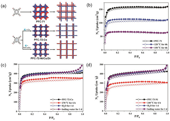 (a) Schematic structures of PFC-71, PFC-72-Co, and PFC-73-Ni/Cu/Zn; (b) N2 adsorption isotherm (77 K) of PFC-71 after different treatments; (c) N2 adsorption isotherm of PFC-72 after different treatments; (d) N2 adsorption isotherm of PFC-73 after different treatments [136].