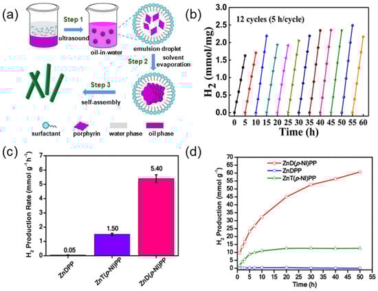 Liu et al. [137] enabled In (III) racemic tetraphenyl porphyrin chloride (InTPP) in microemulsions to assist nucleation and growth through non-covalent interactions (Figure 15a). A series of uniform nanorods with controllable aspect ratios were fabricated by adjusting the conditions, including the concentration of the surfactant concentration. The orderly molecular packing structure allows for effective light absorption and stability of the resulting porphyrin nanocrystals under visible light. These nanocrystals exhibit excellent photocatalytic hydrogen production activity and photostability compared to commercially available InTPP porphyrin powders (Figure 15b). Boddela et al. [138] prepared nanowires with definite morphology via the self-assembly of ZnD(p-NI)PP. ZnD(p-NI)PP exhibited excellent photocatalytic performance and stability compared with ZnT(p-NI)PP and ZnDPP (Figure 15c,d).