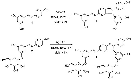 - Velu, S.S.; Buniyamin, I.; Ching, L.K.; Feroz, F.; Noorbatcha, I.; Gee, L.C.; Awang, K.; Wahab, I.A.; Weber, J.-F.F. Regio- and stereoselective biomimetic synthesis of oligostilbenoid dimers from resveratrol analogues: Influence of the solvent, oxidant, and substitution. Chem. Eur. J. 2008, 14, 11376–11384. [Google Scholar] [CrossRef] [PubMed]