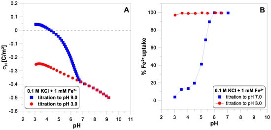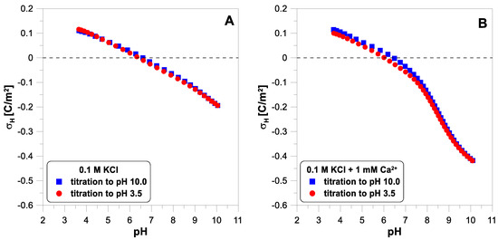 According to Reaction (1), this results in the release of a large number of hydrogen ions from the surface to the solution and a significant reduction in its hydrogen charge, . Generally speaking, the data in Figure 1B and Figure 2B do not represent the net total charge on the surface, , only the charge generated by hydrogen ions, . However, both charges can be equal when no specific adsorption occurs.