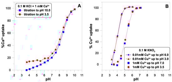 The adsorption edges of calcium (A) and copper (B) ions on titanium dioxide as a function of pH in 0.1 M of electrolyte measured during forward and reverse titration.