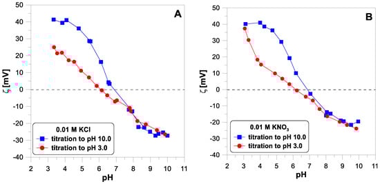 To explain the lack of reversibility of the electrokinetic curves with a change in the titration direction, it should be noted that electrophoretic mobility is a dynamic quantity that may depend on the instantaneous size of the moving particles. Titanium dioxide nanoparticles may agglomerate in a solution as the pH changes. Especially in the pH region close to the IEP (isoelectric point), where the charge of the particles is close to zero, they can easily combine into larger structures. The resulting agglomerates can then disintegrate as the pH changes further and the surface charge increases.
