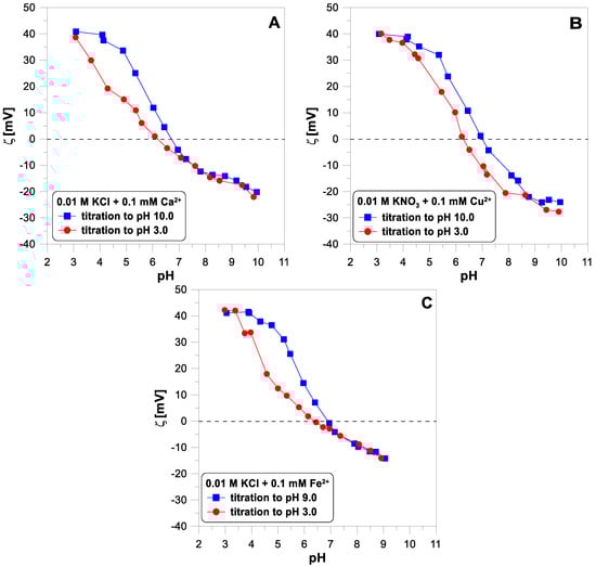 The ζ-potential of particles measured during forward and reverse titration in 0.01 M of electrolytes in the presence of divalent ions at a concentration of 0.1 mM: (A) ; (B) ; (C) .