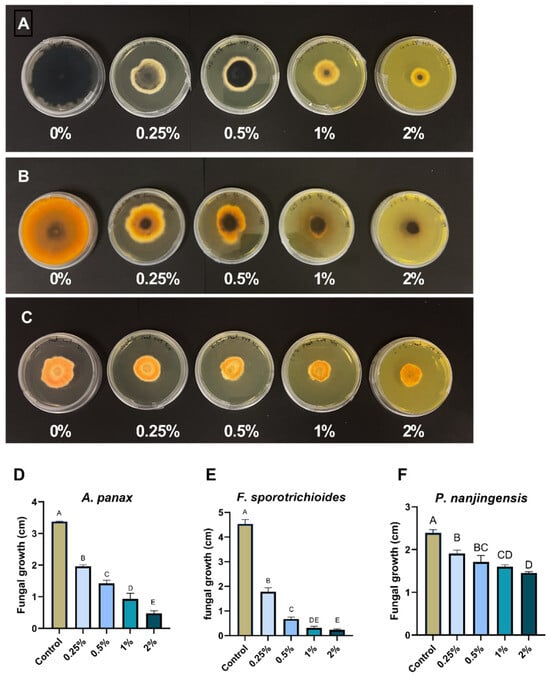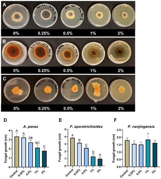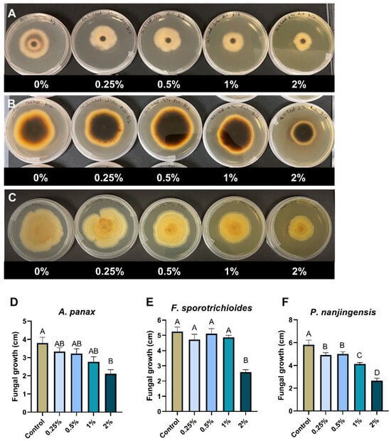 Anti-fungal effect of goldenseal leaf ethanolic extract on the growth of (A,D) A. panax, (B,E) F. sporotrichioides, and (C,F) P. nanjingensis. Different letters on each bar represent values that are statistically different (p < 0.05).