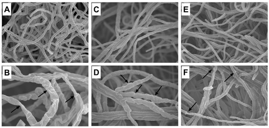 Scanning electron micrographs of A. panax grown on (A) PDA control plate and (B) in the presence of 1% goldenseal root ethanolic extract; F. sporotrichioides grown on (C) PDA control plate and (D) in the presence of 1% goldenseal root ethanolic extract; P. nanjingensis grown on (E) PDA control plate and (F) in the presence of 1% goldenseal root ethanolic extract. Arrows show abnormal mycelia.