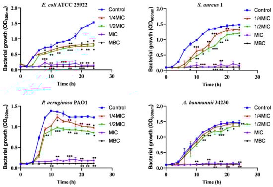 Bacteria were grown in 5 mL Tryptic Soy Broth (TSB) at 37 °C. The bacterial suspension of 106 CFU/mL was collected, and the bacterial culture was divided into four flasks (250 mL), and 1/4 MIC, 1/2 MIC, MIC, and MBC of melittin were added, and the negative control group without melittin was used. The flask was incubated at 37 °C with constant oscillation (200 rpm), and bacterial growth was determined by measuring the absorbance of the culture at OD600 at two-hour intervals after treatment [45,46].