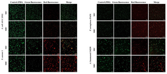 To investigate whether melittin can kill bacteria by breaking the cell membrane, propidium iodide (PI) and SYTO 9 staining were performed after melittin treatment, and PBS treatment was used as a control. SYTO 9 can penetrate the cell membrane of Gram-positive bacteria, Gram-negative bacteria, and living and dead cells and releases green fluorescence. PI cannot penetrate intact cells but can produce red fluorescence after cell membrane destruction. As shown in Figure 3, the control group did not show red fluorescence, indicating that melittin changed the permeability of the cell membrane of E. coli ATCC 25922, S. aureus 1, P. aeruginosa PAO1, and A. baumannii 34230. In addition, the red fluorescence at MBC concentration was greater than that at MIC concentration, indicating that the change in membrane permeability of the four strains gradually increased by increasing the melittin concentration (Table S1). Among these, the cell membrane of S. aureus 1 underwent the most significant permeability change (Figure 3).