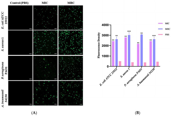 To further determine the changes in cell membrane permeability, in this study, SYTO 9 was co-stained with PI to determine the effect of melittin on bacterial cell membrane permeability [48]. Bacterial suspensions (1 × 108 CFU/mL) were incubated with the MIC and MBC of melittin, and PBS (negative control) at 37 °C for 10 h. Next, 1 mM PI and 10 mM SYTO 9 were added to the cells and incubated for 30 min in the dark. The cells were pelleted after centrifuging at 3500 rpm for 5 min, washed three times with PBS, and resuspended in PBS. Fluorescent images were acquired using a Zeiss LSM 800 confocal microscope (Oberkochen, Germany).