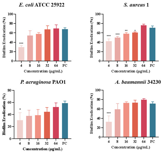 Biofilm eradication of melittin against E. coli ATCC 25922, S. aureus 1, P. aeruginosa PAO1, and A. baumannii 34230. Compared to the positive control group (PC = positive control, azithromycin), data are shown as mean ± SD, and individual biological replicates are shown (n = 3); * p < 0.05, ** p < 0.01, *** p < 0.001 compared with PC group.