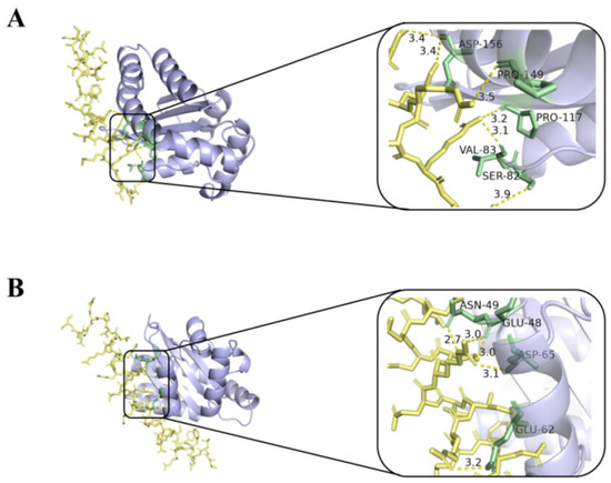 Molecular docking 3D image of melittin (A), LL-37 (B), and LasR protein model. Blue represents the receptor LasR, yellow represents the polypeptide ligand, and green represents the amino acid residues of the polypeptide-protein interaction.