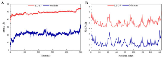 (A) RMSD profile and (B) RMSF profile of LasR-Melittin and LasR-LL-37 during molecular dynamics simulations at 500 ns.