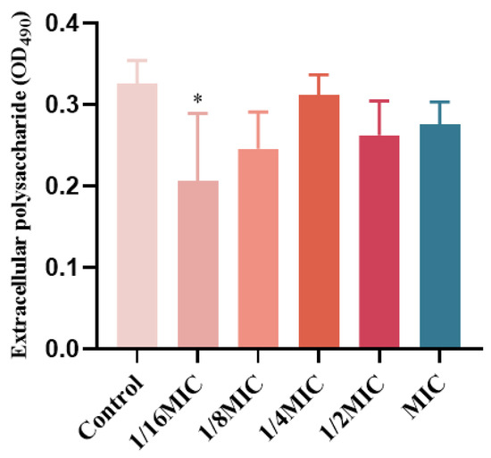 EPS in biofilms are a class of carbohydrate compounds synthesized and secreted by extracellular microorganisms, composed of nucleic acids, polysaccharides, lipids, and proteins, and act as a diffusion barrier to antimicrobial agents [20,21]. P. aeruginosa matrix is derived from secreted proteins and lysed cells [22,23]. Therefore, the effect of melittin on the EPS content in P. aeruginosa biofilms was determined. EPS production was inhibited at concentrations below the MIC (Figure 9), compared with the control (0-melittin) group. The result indicated that melittin could affect the formation of EPS in P. aeruginosa PAO1.