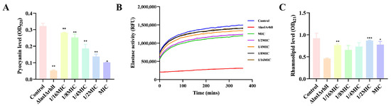 Effects of different concentrations of melittin on virulence factors. (A) pyocyanin, (B) elastase, and (C) rhamnolipid production. n = 3. * p < 0.05, ** p < 0.01, *** p < 0.001 compared with control (0-melittin) group.