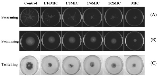 Effects of different concentrations of melittin on swarming, swimming, and twitching motility. (A) Swarming motility, (B) swimming motility, and (C) twitching motility. The results shown are representative of the results of three independent experiments.