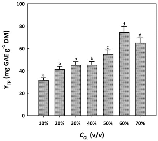 The incorporation of glycerol at a level of 10% was inefficient, as this solvent system provided significantly low YTP (p < 0.05). Switching CGL from 20 to 60% gave practically similar YTP, but setting CGL at 60% provided significantly higher YTP (p < 0.05). A further increase in CGL to 70% did not favor higher YTP. Therefore, the mixture composed of 10% water, 60% glycerol and 30% ethanol was chosen as the most efficacious.