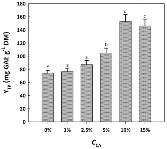 The effect of citric acid concentration (CCA) in the solvent system tested on the yield in total polyphenols. In all cases, the solvent system was composed of 10% water, 60% glycerol and 30% ethanol. Treatments were accomplished at a constant temperature of 90 °C for 180 min. Columns assigned with different letters (a, b, c) represent statistically different values (p < 0.05).