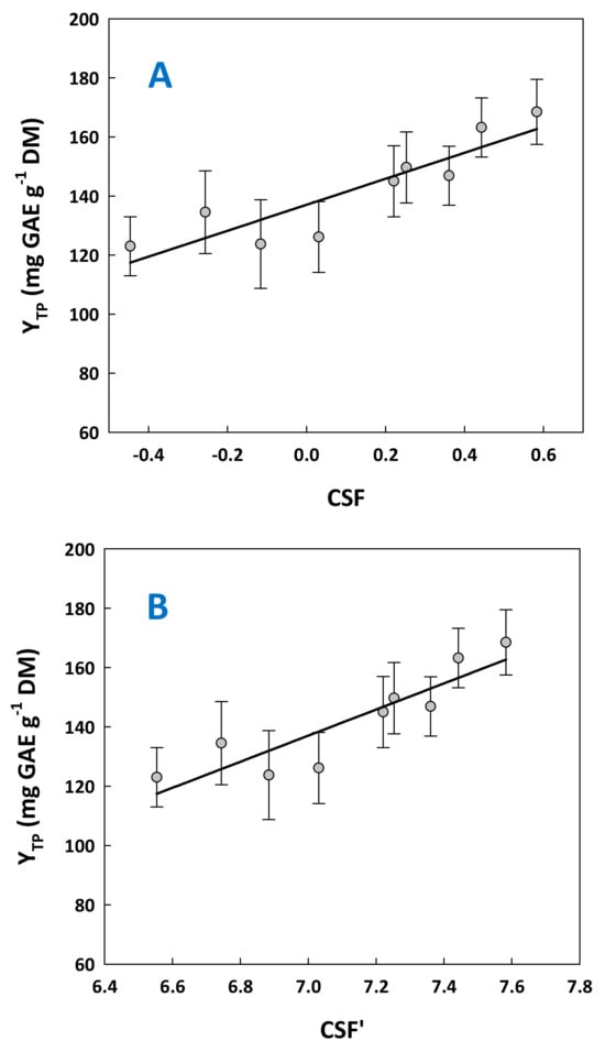 Another issue raised by the data obtained was the correlation between severity and total polyphenol yield. To examine such a hypothesis, YTP values were plotted as a function of both CSF and CSF’ (Figure 4). In both cases, YTP was found to be correlated with treatment severity in a linear manner, described by the following quadratic mathematical models: