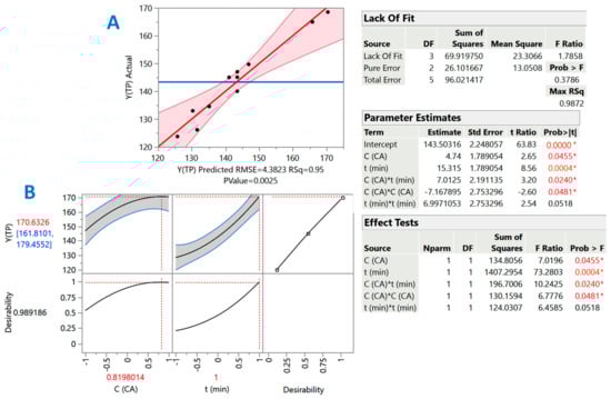 Diagram presenting the correlation between the predicted and actual values of the response (YTP), obtained after implementing response surface methodology. The square correlation coefficient (R2) and the p-value for the model are also given (A). Diagram (B) shows the desirability factor, the maximum predicted YTP, as well as the theoretical optimum CCA and t. The inset tables contain the statistics associated with the response surface methodology. Values denoted with an asterisk are statistically significant (red: p < 0.05; orange, p < 0.001).