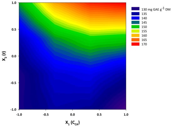 The predicted optimal values for both CCA and t could be determined by the desirability function (Figure 5B), which also enabled the prediction of the maximum response. Thus, under optimal conditions estimated as CCA = 14.1% and t = 300 min, the maximum YTP would be 171 ± 9 mg GAE g−1 DM. To investigate model applicability, three individual extractions were performed under the above-optimized conditions, giving a YTP value of 166 ± 6 mg GAE g−1 DM, which had no significant difference with the predicted maximum one (p < 0.05). This outcome affirmed the validity of the model.