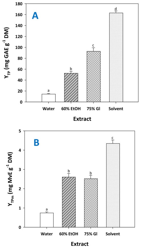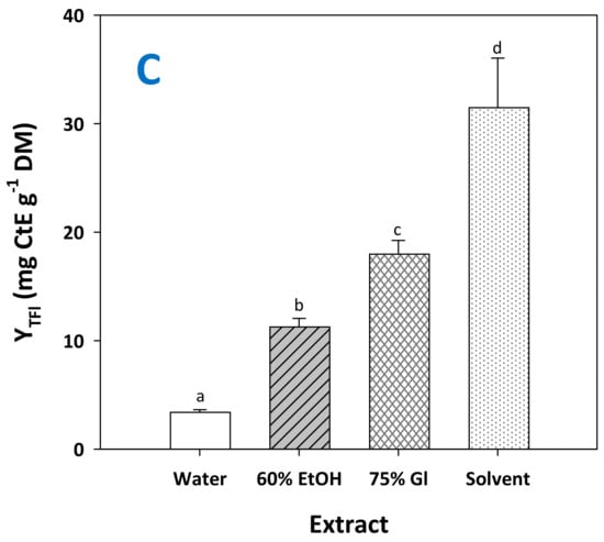 Yield in total polyphenols (A), total pigments (B) and total flavanols (C) achieved by treating RGP with the solvent, under optimized conditions (CCA = 14.1%, t = 300 min). Columns assigned as 60% EtOH and 75% Gl correspond to treatments carried out with aqueous ethanol and aqueous glycerol. Assignments with different letters (a, b, c, d) signify statistically different values (p < 0.05).