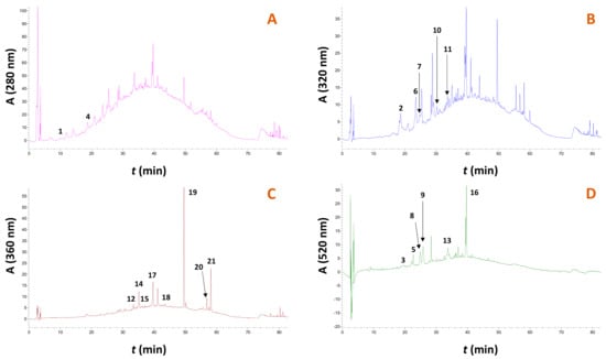 Representative chromatograms of the RGP extract obtained with treatment with the solvent, under optimized conditions. Chromatograms (A–D) were traced at 280, 320, 360 and 520 nm, respectively. Peak assignment: 1, gallic acid; 2, caftaric acid; 3, cyanidin 3-O-glucoside; 4, catechin; 5, delphinidin 3-O-glucoside; 6, p-coumarate derivative; 7, ferulate derivative; 8, petunidin 3-O-glucoside; 9, paeonidin 3-O-glucoside; 10, p-coumaric acid; 11, ferulic acid; 12, rutin; 13, malvidin 3-O-glucoside; 14, quercetin 3-O-glucuronide; 15, kaempferol 3-O-rutinoside; 16, malvidin 3-O-glucoside p-coumarate; 17, myricetin; 18, resveratrol; 19, quercetin; 20, kaempferol; 21, isorhamnetin.