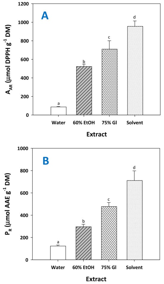 The antiradical activity (A) and the ferric-reducing power (B) of the extract generated after RGP treatment with the solvent, under optimized conditions (CCA = 14.1%, t = 300 min). Columns assigned as 60% EtOH and 75% Gl correspond to treatments carried out with aqueous ethanol and aqueous glycerol. Assignments with different letters (a, b, c, d) signify statistically different values (p < 0.05).