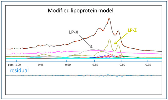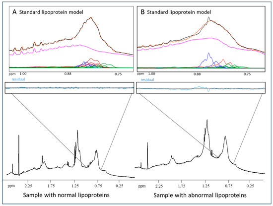 Quantification of LP-X using a standard NMR model: (A) the NMR spectrum of a normolipidemic plasma sample without LP-X, and (B) the NMR spectrum of a sample with relatively high LP-X. The composite of the methyl lipid signals of the lipoprotein components is illustrated with black lines (calculated) and orange lines (measured). The background signal, including the combined signal from the proteins, is in purple, and the signals corresponding to the VLDL, LDL, and HDL subclasses are in blue, red, and green, respectively. The residuals are illustrated in blue below the spectrum.