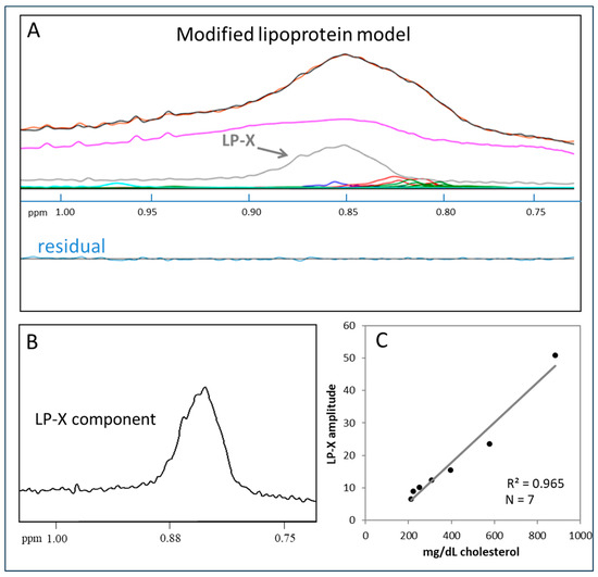 The NMR LipoProfile spectral deconvolution approach relies on the assumption that “the whole (plasma or serum NMR signal) is the sum of its (lipoprotein signal) parts”. Specifically, the measured plasma/serum lipid signal envelope “whole” centered at 0.8 ppm is computationally decomposed into the spectral amplitude “parts” contributed by the component VLDL, LDL, and HDL subspecies, thereby providing their particle concentrations. The standard lipoprotein deconvolution model, which accounts for the contributions of all normal lipoprotein subspecies, analyzes >99% of patient samples successfully as judged by achieving a “match” (high degree of correspondence) between the shape and amplitude of the measured plasma/serum signal and the one calculated from the sum of the derived lipoprotein components. Rare samples for which a “mismatch” is observed between measured and calculated plasma signals are those that contain abnormal lipoproteins that make spectral contributions not accounted for by the standard lipoprotein deconvolution model. LP-X is one such abnormal lipoprotein, and its presence in patient samples can be flagged by observing such a deconvolution mismatch. LP-X in samples identified in this way can be readily quantified by employing a modified deconvolution model that includes a reference standard for LP-X.