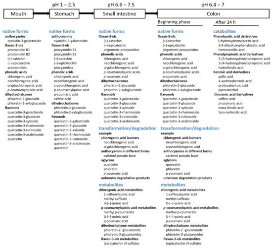 The forms of phenolic compounds from apples that are present in the digestive tract vary according to the different parts of the digestive tract. These differences arise from environmental conditions such as pH. The pH in the stomach is acidic, around 1–2.5 [28,29]. It increases in the proximal small intestine (pH 6.6) and reaches pH 7.5 in the terminal ileum. pH shows a sharp fall to 6.4 in the cecum and increases from the left to the right colon (mean value 7.0) [28]. Similar values of pH or a similar trend were reported in Fallingborg [29] and Nugent et al. [30]. At different pH values, phenolic compounds can be stable or in some cases degrade.