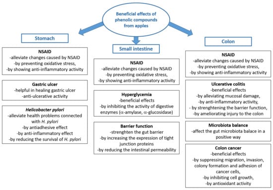 Apple polyphenols can be helpful in the stomach by decreasing the risk of the side effects caused by consuming NSAIDs. Moreover, it has been suggested that phenolic compounds from apples should be evaluated as nutraceuticals to decrease the risk of NSAID consumption [34]. Another way of using apple phenolics in the stomach is against health problems related to gastric ulcers or H. pylori infections. Since mostly native forms of phenolic compounds from apples are present in the stomach, those forms have the potential for the mentioned positive effects. However, most of the described studies ascribe effects to the apple phenolic compounds or apples in general. Further studies might reveal compounds or a group of phenolic compounds with the bioactivity in the stomach.