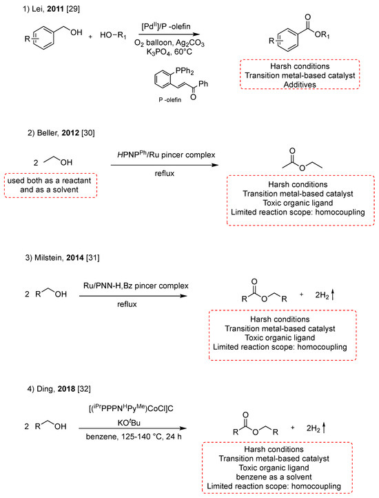 - Tang, S.; Yuan, J.; Liu, C.; Lei, A. Direct oxidative esterification of alcohols. Dalton Trans. 2014, 43, 13460–13470. [Google Scholar] [CrossRef]