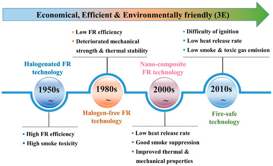 Due to the increasing fire safety demands in the majority of their application contexts, polymeric materials need to be made flame-retardant. Consequently, a vast body of literature has become available on fire-safe polymeric materials over the past few decades. The emerging trend is undoubtedly toward eco-friendly, sustainable, and multi-functional technologies related to forming fire-safe polymeric materials [5,6]. Although many efficient flame retardants have been reported in the literature, transferring these newly arising fire-safe technologies from the research to an industry context will require further progress.
