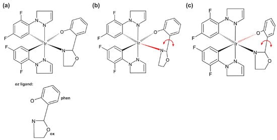 (a) Molecular structure of bis(1-(2,4-difluorophenyl)-1H-pyrazole)(2-(20-hydroxyphenyl)-2-oxazoline)iridium(III) complex, denoted as Ir(dfppz)2(oz) (1), where oz is 2-(20-hydroxyphenyl)-2-oxazoline group. (b) Rotation of the oxazoline group. (c) Rotation of the phenolate group.