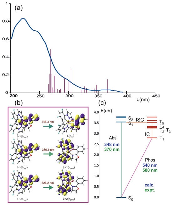 Several lowest excited singlet states are collected in Table 2. All calculated singlet and triplet states are provided in Tables S1 and S2. The three lowest energy calculated transitions presented as vertical bars in Figure 3a can be assigned to the experimental band with a maximum at about 370 nm [44]. The lowest energy one at 348 nm has a character. The nature of the lowest triplet state is the same as that of the lowest singlet (Table S2). This triplet determines the photophysical properties of complex 1. The next two transitions are of the type. The subsequent several calculated transitions between 313 and 283 nm, which can be attributed to the experimental bands at 325 and 290 nm, are of similar nature. At higher energies, the transitions of the type appear, which are responsible for bands with higher intensity. The calculated transition at 252 nm can be assigned to the experimental band at 260 nm (Table S1). This is a typical situation, where * transitions are very intense.