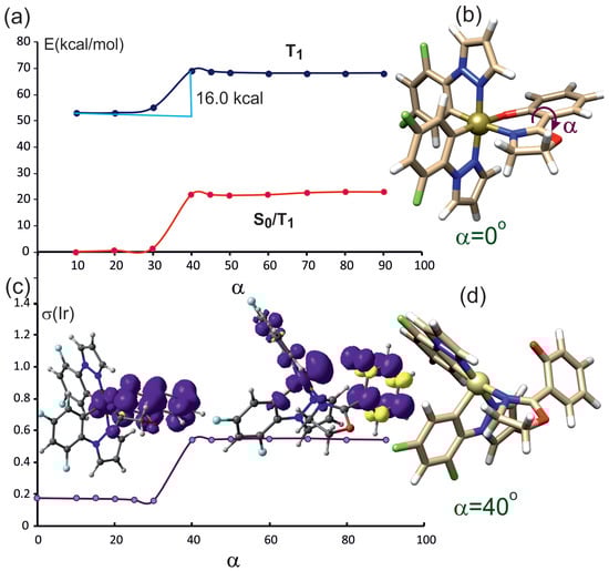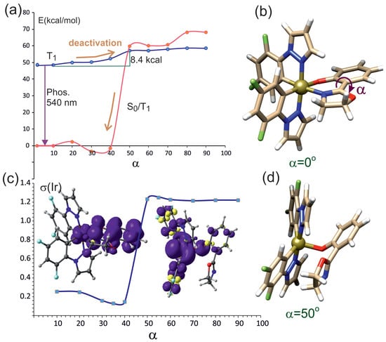In Figure 5a, the PEC for the triplet state and singlet state in the triplet geometry as a function of the rotation angle of the phenolate group is presented. The spin density contours for the triplet state are shown in Figure 5c. They indicate that between rotation angles 30° and 40°, the triplet wave function changes its characteristic from to the state where one electron resides on a d orbital of iridium and the second one resides on the ligand (), as a consequence of phenolate oxygen–iridium homolytic bond breaking. The transition between these two triplet states involves an energy barrier of 16 kcal/mol. The energy of the singlet state is everywhere lower than that of the triplet state, and the curves do not intersect. The presented calculations show that the rotation of the phenolate group does not lead to the nonradiative deactivation of the triplet state in complex 1.